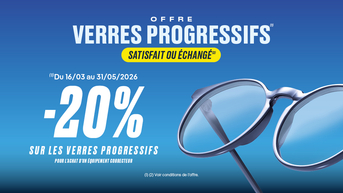 Offre verres progressifs Du 16/03/26 au 31/05/2026, profitez de -20% sur les verres progressifs. Satisfait ou échangé !