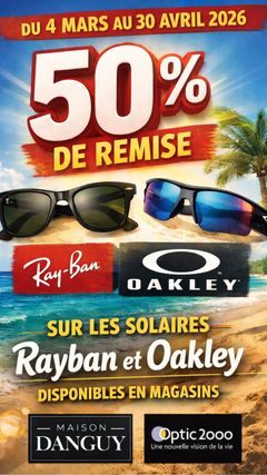 ☀️ OFFRE EXCEPTIONNELLE CHEZ OPTIC2000 MAISON DANGUY 😎 Du 4 mars au 30 avril 2026, profitez de 🔥 -50% de remise sur les solaires Ray-Ban et Oakley 🔥 C’est le moment idéal pour vous équiper avec des modèles iconiques, alliant style, performance et protection optimale ☀️ 👉 Offre valable sur les modèles disponibles en magasin. 👉 Profitez en, ne tardez pas ! Rendez-vous en magasin pour découvrir la collection et trouver LA paire parfaite pour cet été 🌴 #MaisonDanguy #Optic2000 #RayBan #Oakley #OffreExceptionnelle #Solaires #Promo #Été2026