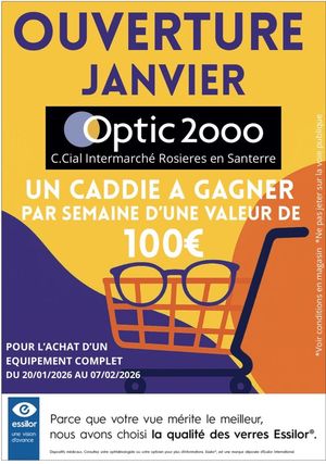 🎉 OUVERTURE Optic 2000 – Rosières-en-Santerre 🎉 Pour fêter notre ouverture, Optic 2000 Rosières-en-Santerre vous gâte ! 🥳 👉 1 caddie de courses d’une valeur de 100€ à gagner chaque semaine 🛒💶 📅 Offre valable du 20/01/2026 au 07/02/2026 🎯 Pour l’achat d’un équipement optique complet Et parce que votre vue mérite le meilleur, nous avons choisi la qualité des verres Essilor® 👓✨ 📍 Retrouvez-nous dans la galerie commerciale Intermarché Rosières-en-Santerre ➡️ Venez nous rencontrer et tenter votre chance !