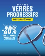 Offre verres progressifs Du 16/03/26 au 31/05/2026, profitez de -20% sur les verres progressifs. Satisfait ou échangé !